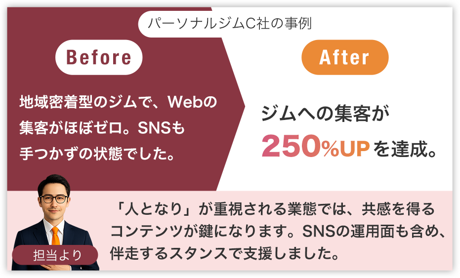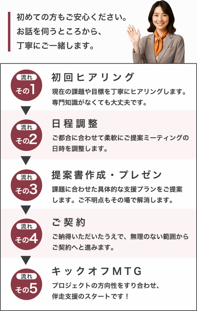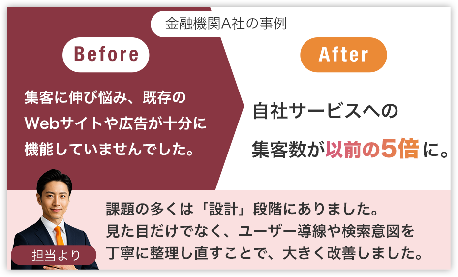お客様ごとに異なる課題に対し、定型パッケージではなく、“成果から逆算した提案”を行います。